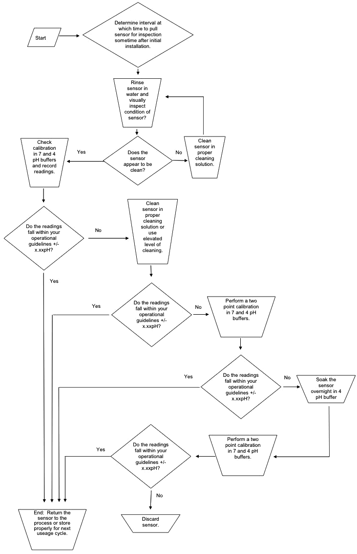 如果讀數與該過程的pH值不匹配,按照前面的步驟清潔探針。參比電極緩沖溶液可能被污染,清潔探針,更換溶液并校準系統。測量電極或參比電極中的緩沖溶液可能已耗盡,填充到所需水平。測量探針的銀/氯化銀線可能已被過程流體化學侵蝕,請更換探針。測量電極的自然老化(使用壽命有限),請更換探頭。大多數制造商都批準了故障排除指南,請按照該指南確定原因和解決方法,典型的指南如下所示。